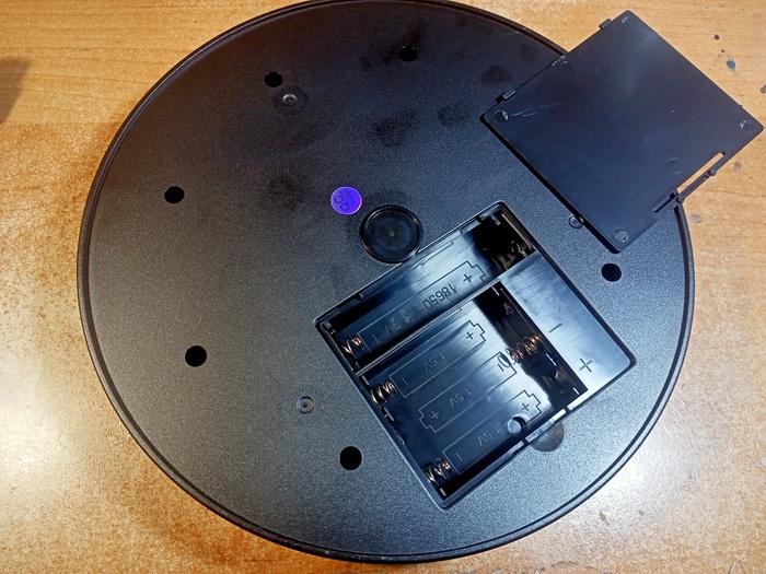 Запитать столик можно по USB проводу. Также вроде внутри имеется собственная батарея, но я не уверен. Отключённая от компа подставка не вращалась. Альтернативные источники питания - три обычных пальчиковых (АА) батарейки или одна какая-то большая батарейка, возможно аккумулятор. Ещё снизу есть отверстия для болтов (которые вряд ли стоит раскручивать) и голографическая наклеечка. Явно оригинальный товар, не подделка!