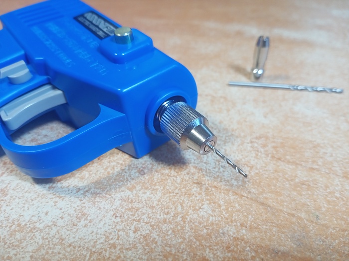 На коробке и в инструкции ясно указано, что инструмент подходит для работы по пластику и дереву. Для более прочных материалов не хватит мощности движка и прочности пластиковых шестерёнок. Впрочем, металл сверлить мне обычно и не приходится. Тест-драйв проведём на смоле, литнике от самой дрели и твёрдой дощечке. Используем свёрла 1, 2 и 3 мм. Как видим, сверло 1 мм зажимает впритирку, меньше уже нельзя.