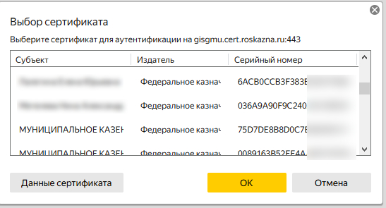 1) Обращаюсь к разработчикам Яндекс браузера - сделайте выбор сертификата хотя бы как в хромиум гост - у вас маленькое окно без возможности изменить его размеры и очень не информативное отображение параметров сертификатов. Серийный номер вообще не нужен. нужны фио, организация, издатель, дата начала и дата окончания действия сертификата.