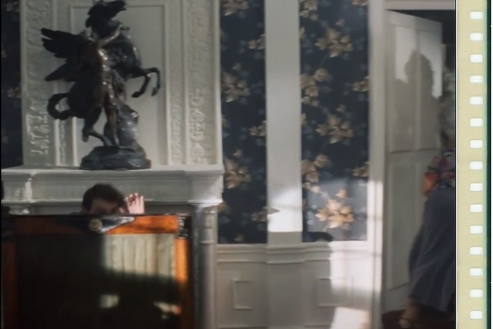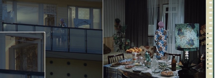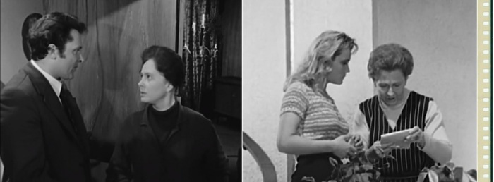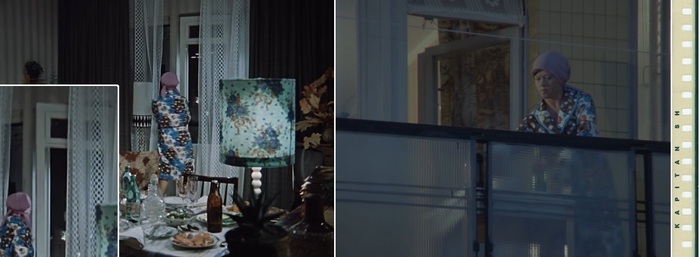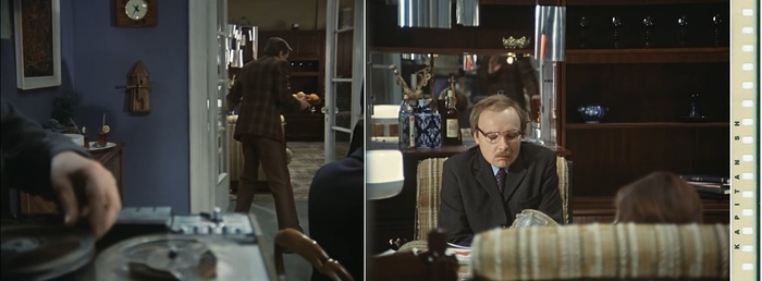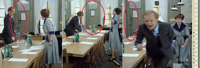 Вторая попытка Новосельцева «приударить» за Калугиной. Самохвалов закрывает двери в комнату, держа в правой руке вазу с фруктами, при смене плана руки у него свободны (правое фото, центр кадра, дальний план). На какой-то момент показывают только его лицо, а значит, что фрукты мог перехватить из тех, кто находился рядом. В этом кадре киноляп скорее в том, что Самохвалов закрывает дверь второй раз.