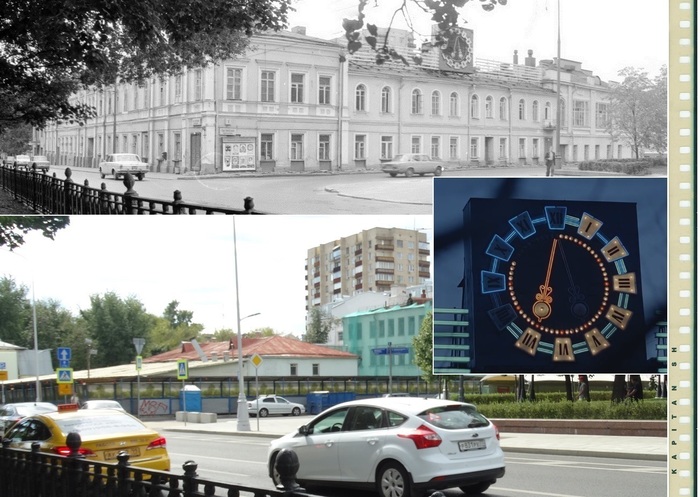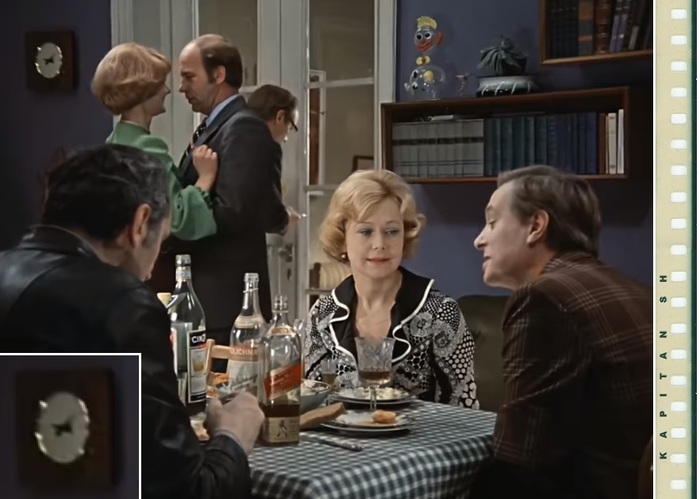 Очень необычные часы мы видим на экране всего несколько секунд, перед сценой ожидания Новосельцева во дворе дома Калугиной. Эти уличные часы были установлены в 1976 году на крыше углового дома, на пересечении улиц Тверской бульвар и Сытинский переулок. В настоящий момент ни дома, ни этих часов не существует.