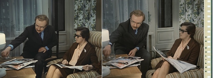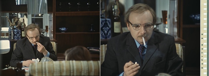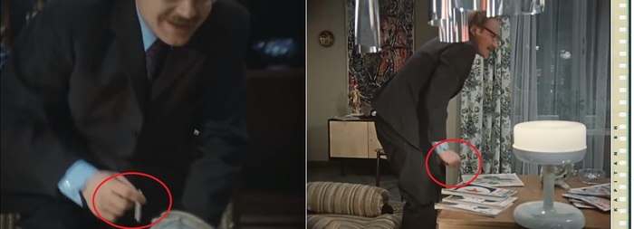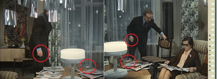 Ладно, в следующем кадре обращаем внимание на хрустальную пепельницу. Через несколько мгновений в ней появляется окурок, ну или не потушенная сигарета. И у Новосельцева сигарета вновь появилась. Получается, он еще и фокусник. Калугина до этого не курила.