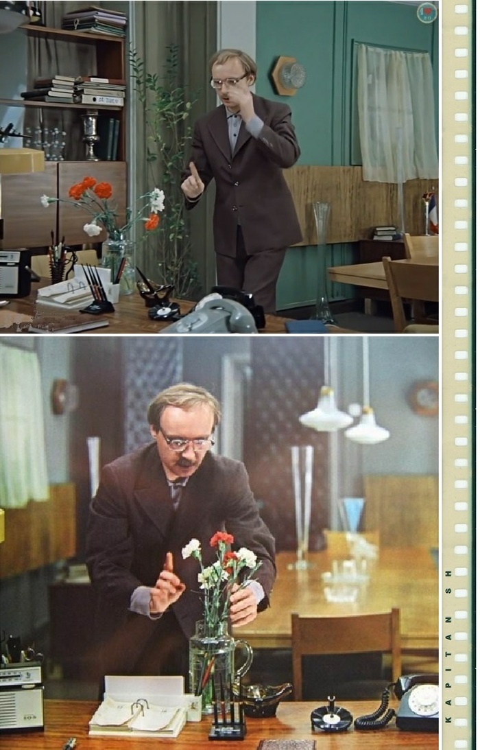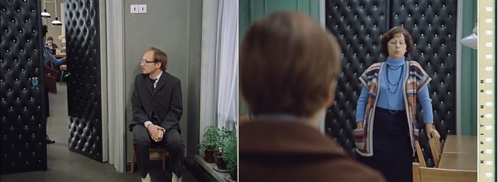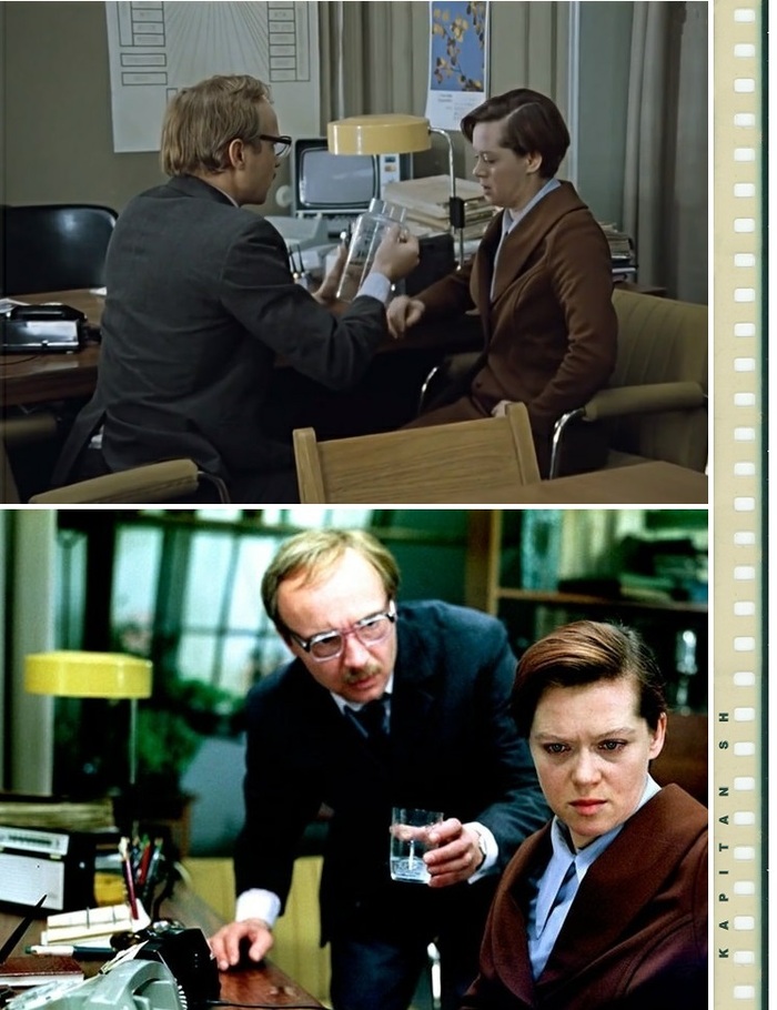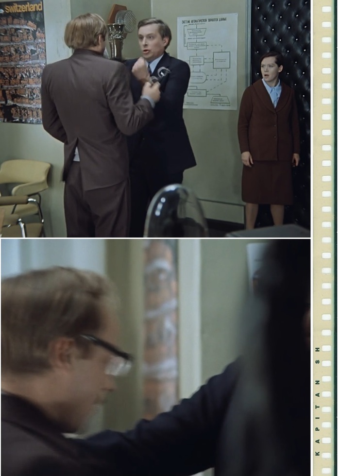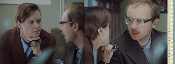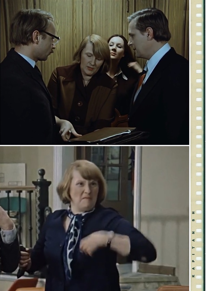 Можно конечно еще придраться, что пока Верочка, разговаривая с Новосельцевым, держит папку правильно, а возвращаясь к Калугиной, она ее уже перевернула, но спишем это на шаловливые женские ручки.