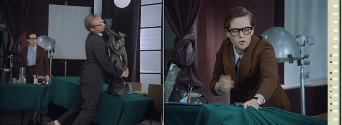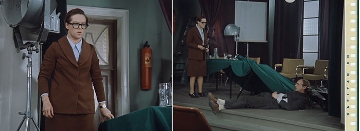 Сцена в актовом зале. Новосельцев с лошадью падает на стол, Калугина, пытаясь хоть что-то удержать, хватается за сукно, лежащее на столе. В этот момент пиджак на ней расстегнут. Но вот через мгновение оказывается, что он застегнут на все пуговицы.