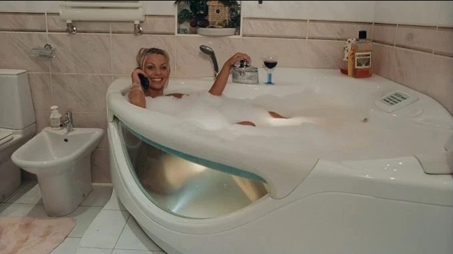 Калугина пытается облить водой из стакана Новосельцева, но все попадает на стену. Через некоторое время мы видим, что следы от воды изменились. Можно было бы сказать, что стена подсохла, но еще через мгновение стена снова становится обильно обрызганной и даже с подтеками.