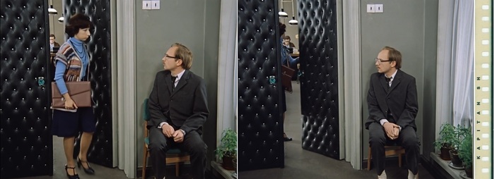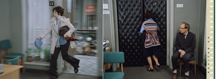 Но на этом приключения чудо-папки не заканчиваются. Верочка выходит из кабинета также с папкой в руках и тут же возвращается, чтобы сообщить, что на прием просится Новосельцев. Заходит в кабинет она с папкой, а вот докладывает Калугиной уже с пустыми руками. Но на выходе из кабинета папка оказывается снова в ее руках.