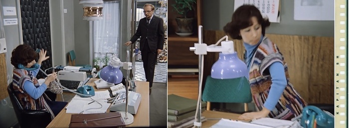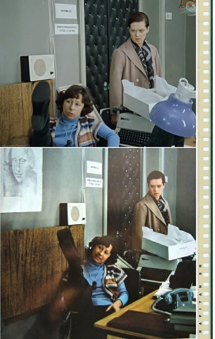 Секретарша Верочка, опаздывая на работу, вбегает в брюках, а через некоторое время она заходит в кабинет Калугиной уже в юбке. Этот момент, как и два предыдущих, я бы тоже не стал называть ляпом, ибо Верочка модница и могла, приехав на работу, переодеться. А в брюках она была только потому, что в городском транспорте так удобнее. Возможно должен был быть кадр, где она с мужем приехала на мотоцикле, естественно в брюках.