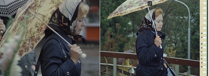 Ручка зонтика странным образом меняется. Сколько я смотрел этот кадр, не могу понять, как этот ляп мог получиться. Зонт явно один, съемки тоже проходили в один день. Могу только предположить, что ручка сломалась или развалилась, а при съемках второго дубля не стали заострять на этом внимание.