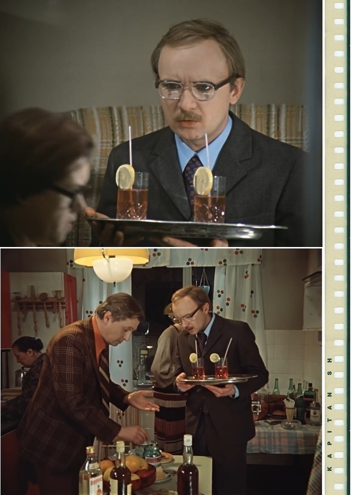 Оправдать это можно только в этой сцене. После первой неудачи Новосельцев приносит стаканы на кухню, и они уже менее наполненные, чем были при разговоре с Калугиной. Можно предположить, что перенервничав, по дороге на кухню он отпил из обоих стаканов, а иной цвет напитков, это просто результат разного освещения.