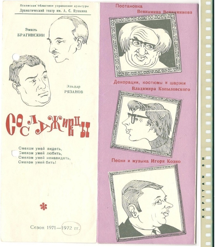 «На гастрольной афише театра мы увидели название нашей пьесы «Сослуживцы». Это была приятная новость, и мы с Брагинским решили, что обязательно съездим в город, посмотрим спектакль. Почему получилось так, что мы не обратились к администрации театра, а просто купили билеты в кассе, я не помню! Несомненно, этим нашим поступком управляла рука судьбы! /…/ Но мы пошли на свой спектакль непроторенным путем, то есть через кассу. /…/ Мы купили красочную картонную программку, которую украшали шаржи на актеров, занятых в пьесе. Под каждой карикатурой были помещены стихотворные эпиграммы. К примеру, под гротесковым портретом артистки В. Ланкевич, играющей Калугину, шли такие строчки:
