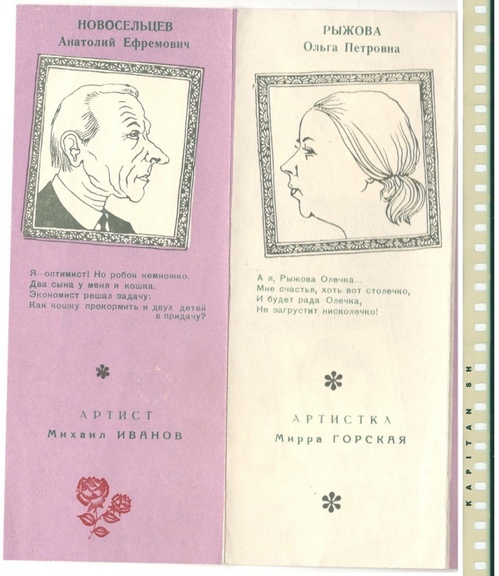 «В программке указывалось, что авторами стихов являются два артиста, играющие роли Новосельцева и Самохвалова, а именно, вышеупомянутый М. Иванов и Ю. Пресняков. Мы по наивности решили, что они авторы только эпиграмм. Но, как вскоре выяснилось, мы их недооценили.