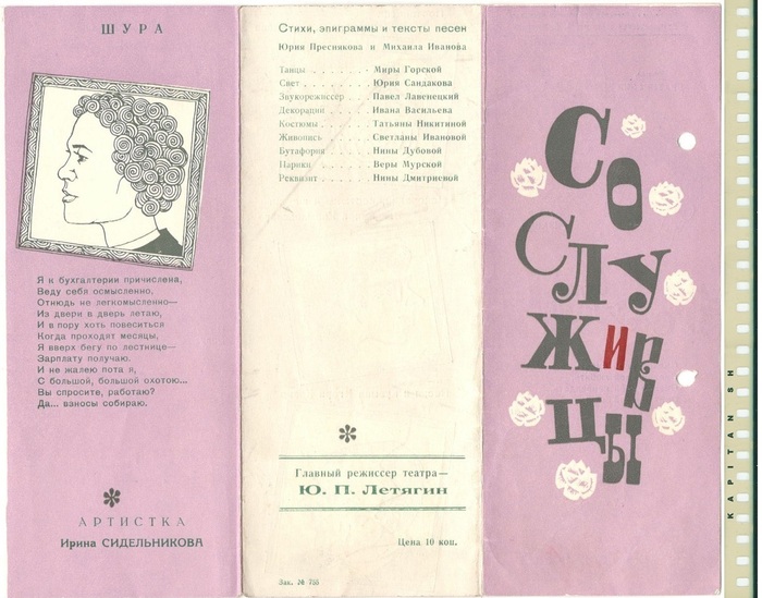 К сожалению, за давностью лет, материалов по той постановке осталось мало. Нет сценария с теми стихами и даже фотографий спектакля. Зато сохранилась программка.