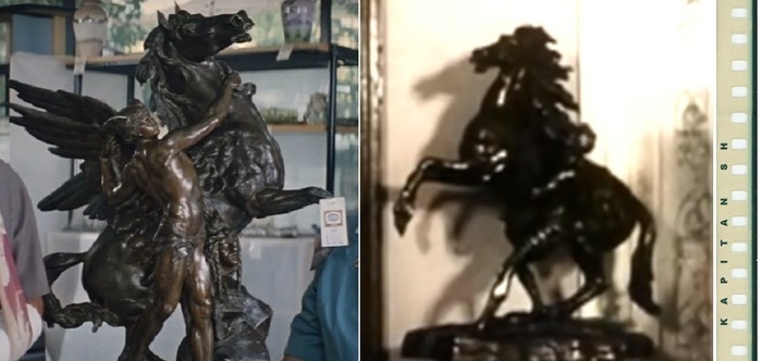 Бытует мнение, что эта же статуэтка снималась в «Семнадцати мгновениях весны». Действительно, в 11 серии есть конное изваяние, но как сказал Семен Семенович Горбунков: «Такой же, но без крыльев». Сравните сами, и как говорится, найдите пять отличий. Там и всадник с другой стороны, а если посмотреть еще повнимательнее, то и форма хвоста другая, у коня конечно.