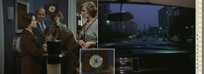 Эти часы мы видим в кадре при втором заходе Новосельцева к Калугиной, и они показывают ровно тоже самое время, что и через шесть минут, когда Калугина собирается домой, а это значит, что часы просто неисправны. Кстати, такая же беда с часами в кабинете Калугиной, но они остановились на 9:30.