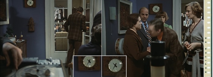 На этих часах другое время только при первом подходе (на предмет "приударить") Новосельцева к Калугиной, но будем считать, что кто-то из гостей решил часы покрутить, но в кадр это не попало.