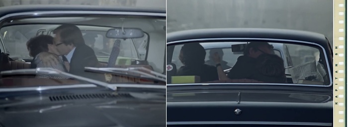 Финальная сцена: Новосельцев залезает в служебную машину Калугиной (вообще интересное место убежища), где она его и настигает. Смотрим на полку под задним стеклом. Зеленая коробочка и аптечка на одной стороне и что-то непонятное на другой. Смена плана и видим, что аптечка оказалась перевернутой, а с другой стороны появилась газета и пара книг. Но в этом кадре машина уже едет вниз, от Лубянской площади, а стартовали они с Кузнецкого моста. Это значит, что в страстном поцелуе они уже минут пять и за это время перевернуть в машине, можно было все, что угодно. Объективно говоря, я бы не считал этот момент ляпом.
