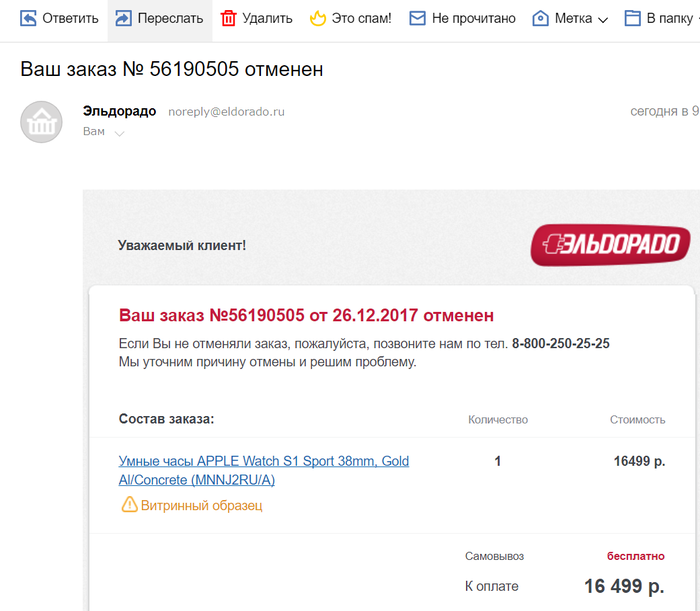 20,5к!!! За ночь часы подорожали на 4к, Карл!! Сначала некая Оксана из тех поддержки сообщила, что заказ мой выполнить не удастся, т.к. товара нет в наличии. На резонный аргумент, что товар представлен на сайте да еще и по цене на 4к больше, чем вчера - мгновенно ретировалась вместе с чатом. Но, Эльдорадо, видимо, не бросает клиентов в беде и появилась Светлана: