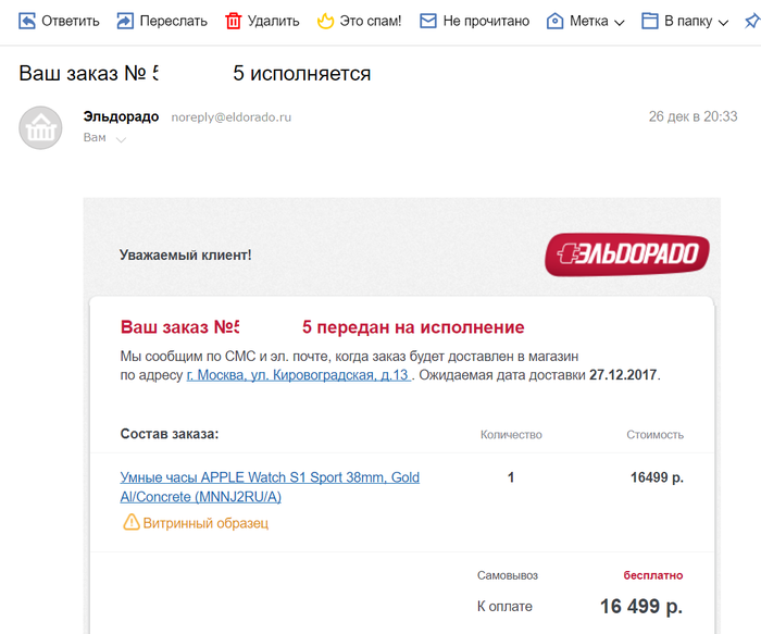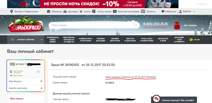И.. О чудо, товар еще и со скидкой 4к, т.к. витринный образец! Было решено, оставим заказ, утром смотаюсь посмотреть на возможные дефекты, если все устроит - заберу и побуду Дедом Морозом с долгожданным подарком.. Но, как говорится, не долго музыка играла, не долго фраер танцевал. Утром решил проверить статус заказа, т.к. ехать до того магазина, где они находились, не очень то и близко. Открываю сначала сайт и вижу картину: