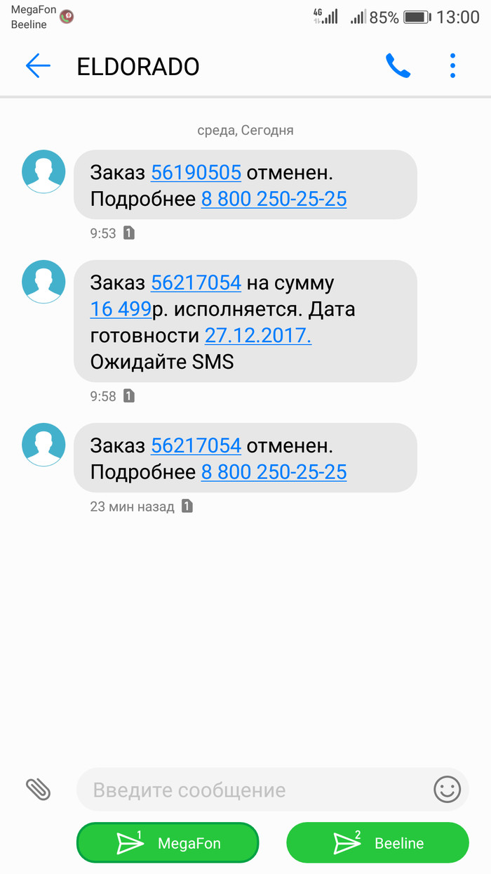 Не долго заставили они себя ждать, ответ пришел в 12.30 со звонком от Светланы и смс уведомлением, что заказ снят по причине отсутствия на складе