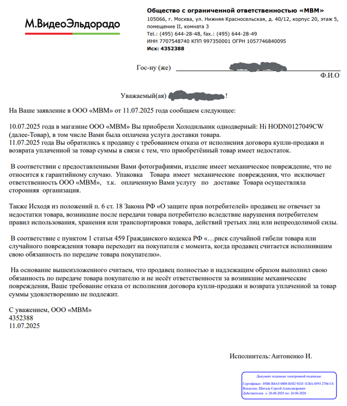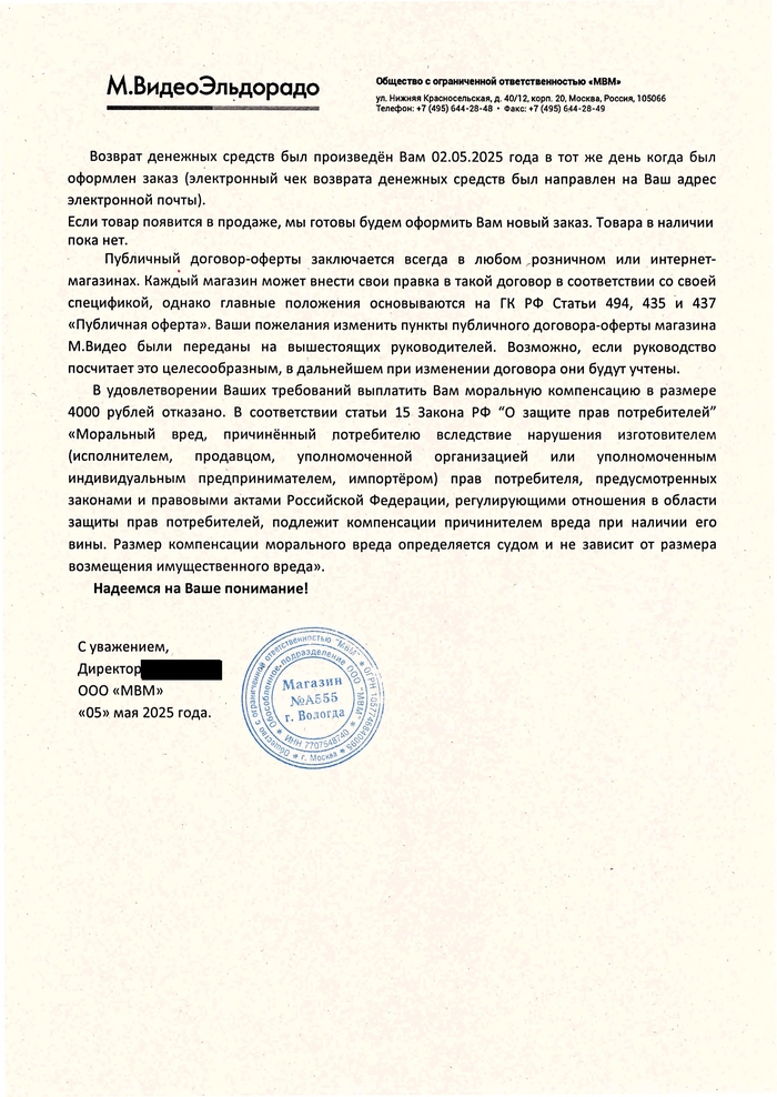 Итогом этой истории стала закономерная кара: мы написали в общество защиты потребителей, благо эта организация работает адекватно. И (сколько дней не помню, немного) получили от них ответ, и ответ магазина типа приезжайте за деньгами. Ох как у них рожи то у всех поменялись, видимо под хвоста им всем напихали знатно. И манагеры все шелковые были, и директор тоже, и охранник ласковый. И у всех морды грустные грустные. Только видимо продавца идиота не предупредили, тоже не хотел нам бабки возвращать, в итоге то ли директор, то ли главный манагер вышла, пошикала на него, быстренько бумаги оформили, приложил карточку и получил деньги обратно.