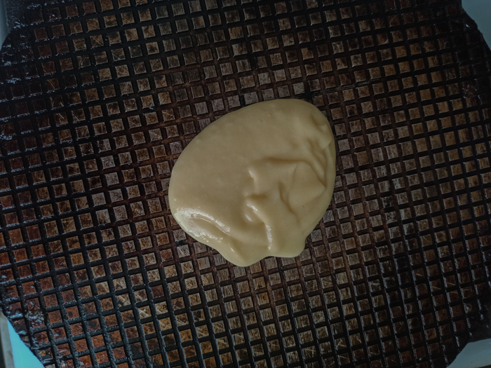 Хорошенько прогреваем вафельницу и выкладываем по середине тесто ( 1 ст.л будет достаточно) . Ждём минуты 3.