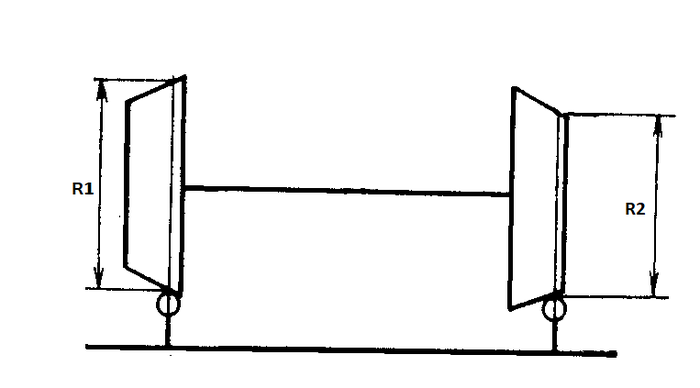 Ок, мы посадили два колеса на одну ось. Но перед нами возникает проблема: прохождение кривых пути. Нарисовал в Paint рисунок, это колёсная пара в кривой (вид сверху):