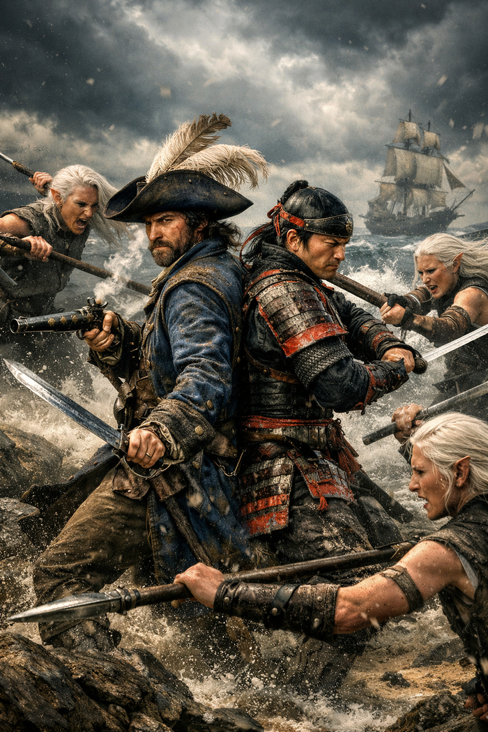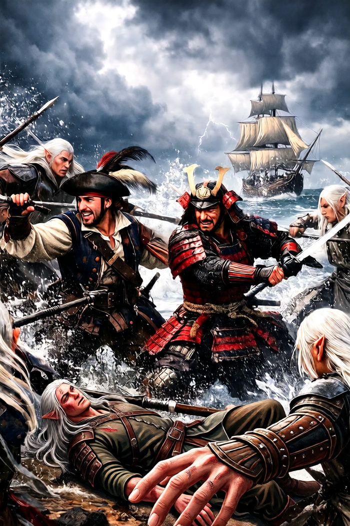 Замыкали колонну те, кто прикрывал отход, отступая короткими перебежками. Мои голландские мушкетеры. И с ними — наёмники, которые дрались за Ост-Индскую компанию за обещанную золотую долю в прибыли от рейда. Я видел широкую спину Хендрика, моего лейтенанта, в панцире со свежей вмятиной от удара. Рядом с ним бесшумными тенями двигались в тёмных, стянутых шнурами пластинчатых доспехах и широких штанах — самураи-ронины, нанятые ещё на острове Ява. В руках были длинные изогнутые мечи, японские алебарды и тяжёлые, с шипами, железные дубинки. Рядом с ними бежали их соотечественники, профессиональные разведчики и убийцы в чёрных одеждах, с закрытыми лицами. Говорили, что они умеют ходить по веткам, не шевеля листом, и убивать одним прикосновением. Их умения и помогли нам взять деревню без лишнего шума — именно они вместе с молуккскими охотниками за головами сняли эльфийских дозорных на деревьях.