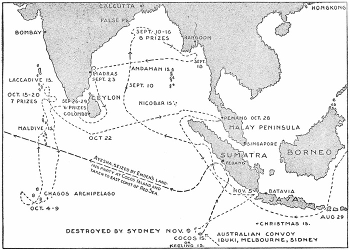 За время своего крейсерства "Эмден" затопил или захватил 23 торговых судна (преимущественно британских, но 4 августа 1914 г. ему попался и пароход российского Добровольного флота "Рязань"), однако никто из экипажей и пассажиров при этом не пострадал, все они принимались на борт "с вещами" и при первой возможности отпускались на свободу со встреченными нейтральными судами.