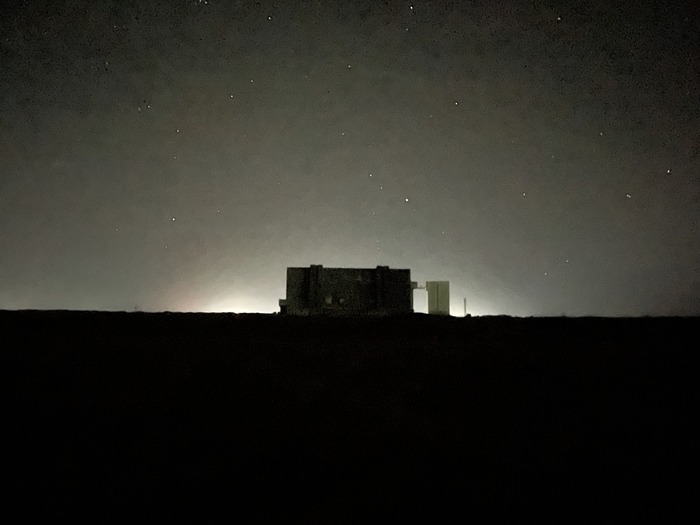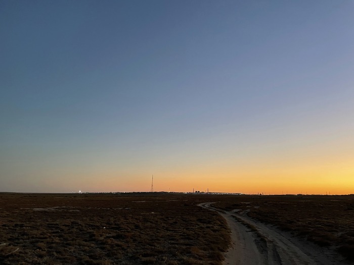 Рассветает. На момент следующего фото мы идём пешком уже целых 12 часов. Мы и подумать не могли, что путь до первой точки займёт столько времени, расчёт был на не более чем 8 часов. Как так вышло? Мы напутали координаты и пошли до совсем других руин, не до тех, где обычно ночуют нелегальные гости Байконура. Это добавило нам лишних целых 6 часов пути, но зато так мы оказались ещё ближе к стартовой площадке. В этой ошибке был и ещё один серьёзный "плюс", о котором мы узнали уже потом — об этом расскажу в конце.