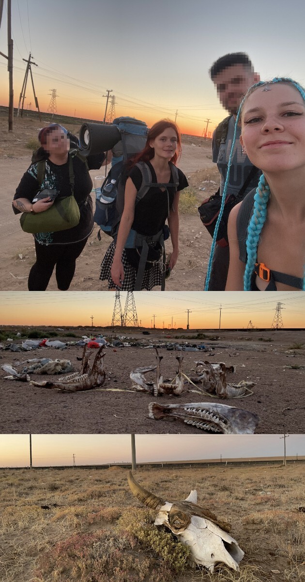В начале степи, ещё совсем близко к Торетаму, встречались и горы мусора, и останки животных. Идти уже было очень тяжело, а чтобы надеть рюкзак после привала, женской части приходилось делать это, садясь на землю, перекатываясь к верху спиной, и только встав, выпрямляться. Так что к каждому отдыху прибавлялись лишние пара минут.