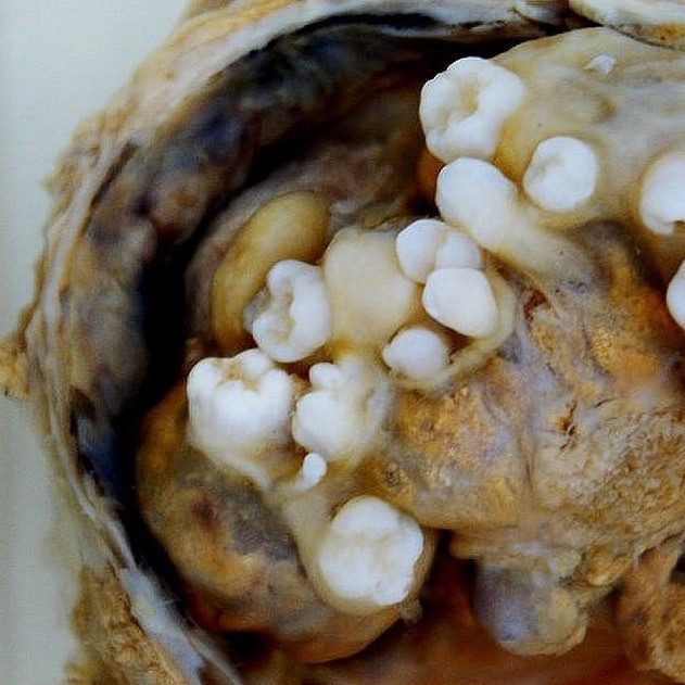 Мы ушли в сторону, а про то, почему появляются антитела, так и не выяснили. Появляются они из-за тератомы. Дело в том, что тератома - это опухоль из зародышевых клеток, которые дают начало всем другим клеткам организма. Чаще всего она локализуется в яичниках или яичках и может содержать в себе разные ткани - волосы, зубы, мышцы, кости и даже подобия органов. В этом случае в ней содержится нервная ткань с нашими NMDA-рецепторами. В какой-то момент тератома презентует иммунной системе эти ткани с рецептором, а так как они не знакомы (помните, что мозг очень рано изолироваться от иммунной системы), то воспринимаются как чужеродные и к ним вырабатываются антитела.