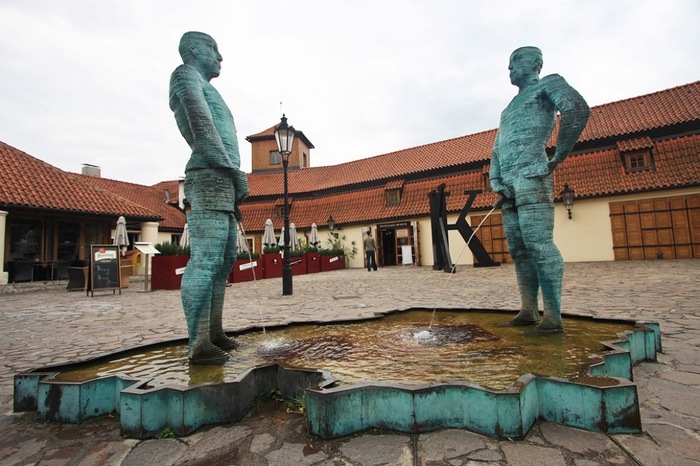 Я так понимаю прототипом послужил "Писающий мальчик" в Брюсселе , но авангардный автор не остановился на это ( к сожалению). Как оказалось, две статуи мужчин ростом в 210 см испражняются  на карту Чехии и одновременно выписывают цитаты знаменитых пражан: таз двух скульптур является подвижным и управляется при помощи компьютера. А также вы можете блеснуть своим талантом и отправит свою цитату на номер телефона ( +420 724 370 770 ).  Через несколько минут после получения послания, мужчины постараются воспроизвести его содержание- правда здорово!  И в заключение скажу, что скульптура расположена на против музея Франца Кафки и по словам некоторых форумов и туристических сайтов, эта скульптура помогает привлекать внимание туристов к музею... Вы серьезно?