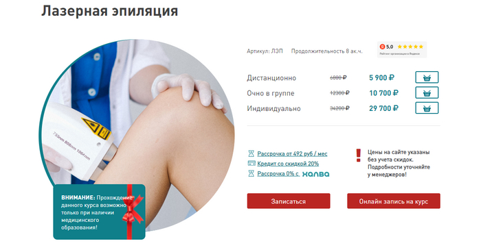 Лазерная эпиляция от НОВЫХ ЗНАНИЙ. Возможна очная или заочная подготовка. Стоимость составляет 10 000 рублей при обучении в группе, 25 000 рублей по индивидуальной программе.