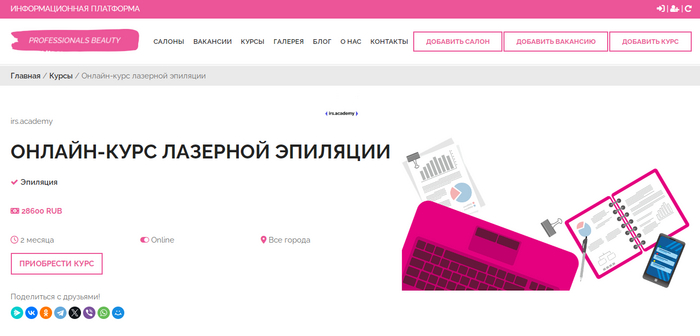 Обучение лазерной эпиляции от EPIL SALON. Еще одно недорогое предложение по подготовке специалиста. По окончании выдается сертификат. Стоимость обучающих материалов 4 500 рублей.