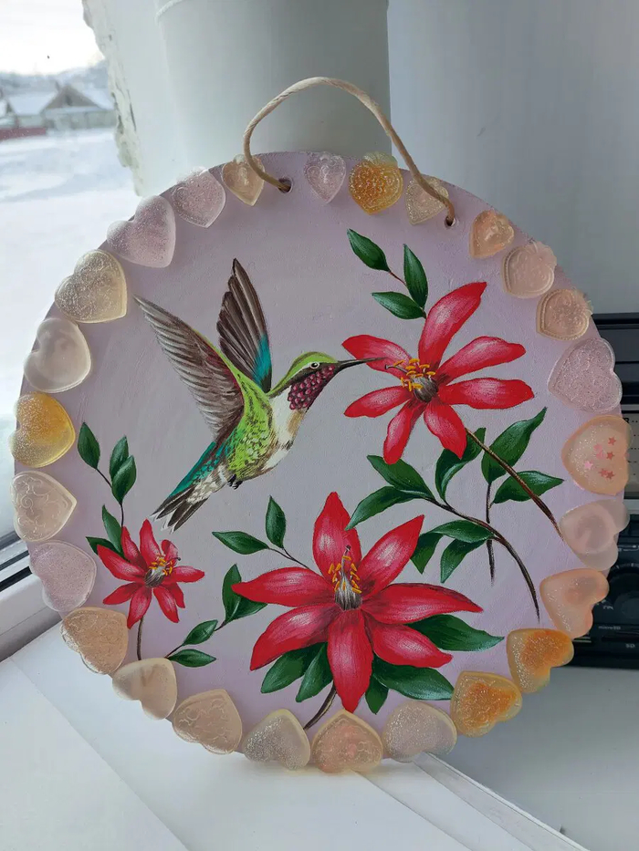Так что колибри я рисовала ради этой рамочки из сердечек. В связи с сем заключаю: если есть план обклеивать картину эпоксидными цацками, то лучше без крупных добавок - при взаимодействии с клеем они дают эффект в виде странных ржавых пятен.