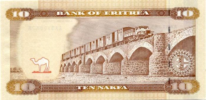 И действительно–на реверсе банкноты номиналом 10 эритрейских накф изображен железнодорожный состав, пересекающий по мосту реку Обел.