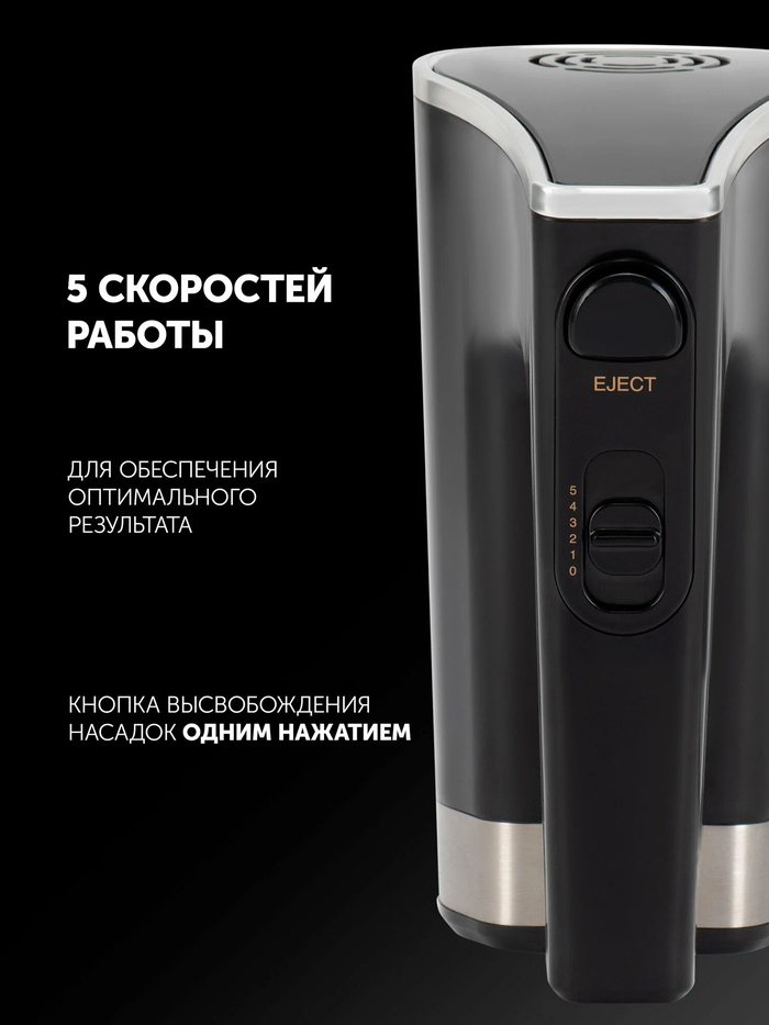 Удобство эксплуатации: Венчики и крюки для замеса теста быстро снимаются одним нажатием кнопки, облегчая чистку устройства и поддерживая гигиеничность процесса приготовления пищи.
