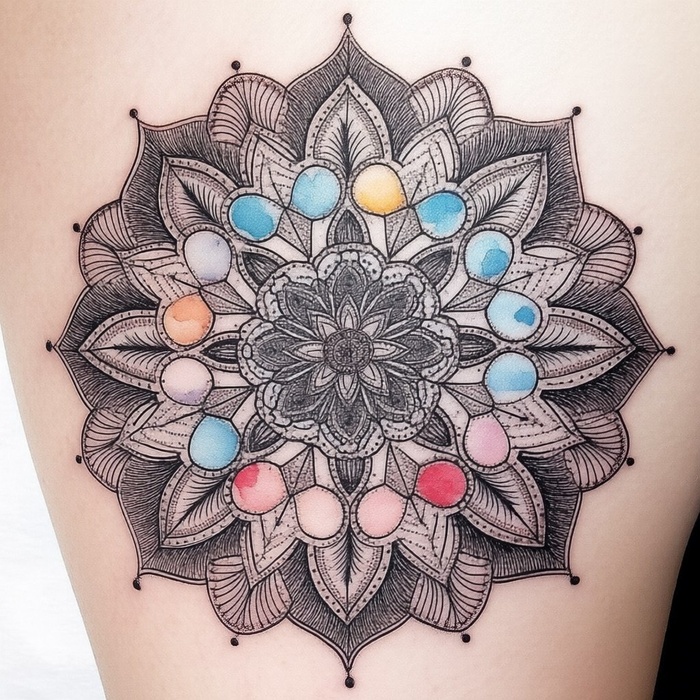 "Эскиз тату мандалы дотворк плюс акварельные детали"