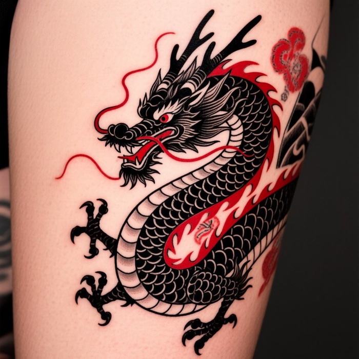"Эскиз тату тигра в японском стиле, черный, красный и серые цвета, тонкий контур, заливка, дотворк"
