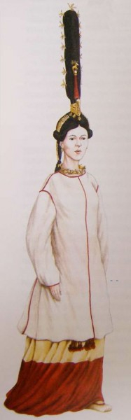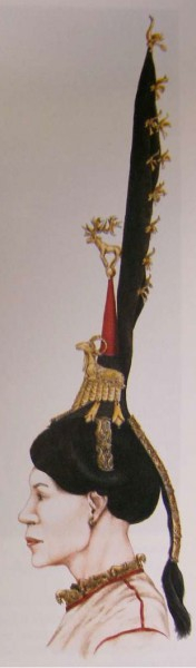 Черная масса, сформировавшая парик, обтянута конским волосом. Парик украшен деревянными накосниками, покрытыми золотой фольгой. На парик крепился головной убор - высокое (61 см) сооружение из войлока в виде длинного лепестка, обтянутое черной тканью. На него нашито 15 деревянных птичьих фигурок, обклеенных золотой фольгой. В каждую из них отдельно вставлены крылышки, лапки и хвостик из кожи. На парик крепилась, как кокарда, деревянная фигурка лежащего оленя с раздвоенным туловищем, в золотой фольге. Еще одно украшение прически - чехол из красной шерсти, надетый на прядь собранных на макушке волос, в него воткнута бронзовая булавка с деревянным навершием в виде оленя, стоящего на шаре (все в золотой фольге).