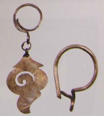 В ушах Алтайской принцессы были самые простые золотые серьги (на фото справа), хотя в некоторых погребениях встречаются серьги с подвесками в виде стилизованных грифонов (на фото слева). Серьги носили все пазырыкцы - и мужчины, и женщины.