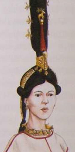 В головном уборе также повторяется символика татуировки Алтайской принцессы. Украшения вырезаны из дерева и обернуты золотой фольгой, как и все золотые украшения пазырыкцев. Высокий головной убор с золотыми украшениями, очевидно, был важной составной частью облика женщины.