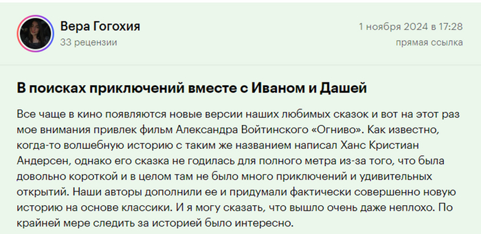 Как итог, стоит заметить, что в фильме, который основан не только на «Огниве», но который отлично передаёт его настроение, и он не называется «Огниво», а честно именуется по-другому, в то же время фильм 2024 года, которая к сказке имеет отношение… да никакого… гордо именуется «Огниво». А «Старую, старую сказку» рекомендую посмотреть.