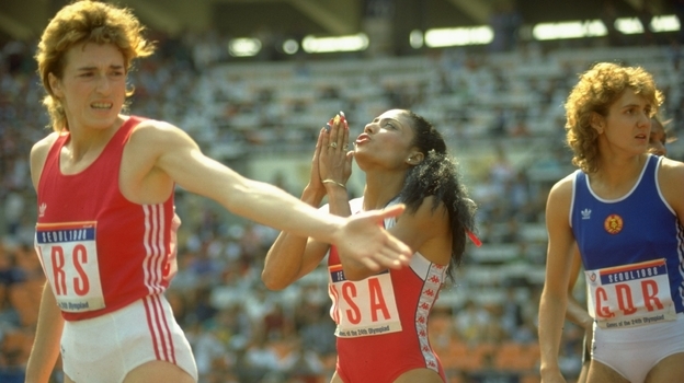 400 метров в личных соревнованиях на этой Олимпиаде выиграла Ольга Брызгина с результатом 48,65. На снимке она готовится уйти на последний этап эстафеты 4х400 метров. В двух метрах за Ольгой приняла эстафету победительница на 100 (10,54) и 200 (21,34- мировой рекорд) метров американка Флоренс Гриффит Джойнер. Убежали на этап с разрывом два метра, также и финишировали. Видео этой эстафеты я неоднократно смотрел. Обратите внимание: сборные СССР и ГДР в западногерманском «Адидасе».