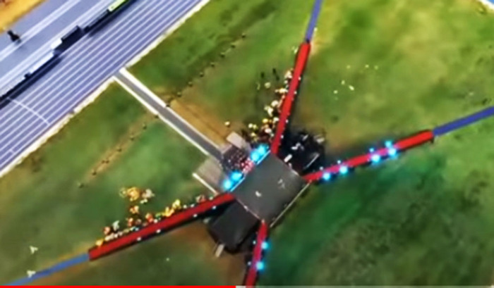 Вид сверху на стадион. Участники выходили сперва на подиум в центре поля, их представляли зрителям. Те, кому бежать 4х400 метров, шли, естественно, в одну сторону, где старт- финиш. А вот участники и участницы эстафет 4х100 метров расходились по четырём наклонным дорожкам каждый к месту своего старта. Вокруг подиума постоянно тусились типа латиноамериканские чирлидеры и чирлидерши в карнавальных одеждах.