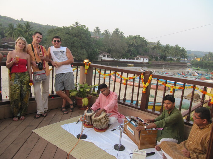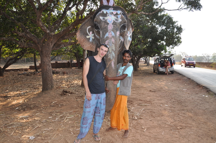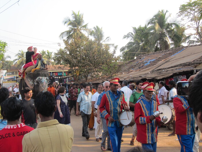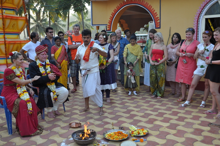----------- Свадьба. Однажды вечером мы валялиcь на пуфиках на пляжу и к нам подошел англичанин.широко улыбаясь он предложил нам завтра посетить свадьбу его лучшего друга. Рассказал, что тот женится на польке. он хотел найти поляков, но не смог, но сказал, что русские тоже подойдут. и к тому же мать невесты хорошо знает русский. также он сказал, что будет слон и шампанское! (шампанское в найти в Гоа не так просто) такое мероприятие пропусть мы просто не могли! также сказал , что будет обряяд в индуистском храме, музыканты. Мы кончно соглачились и на следущий деь были при полном параде возле храма. Жених привез невесту на слоне.