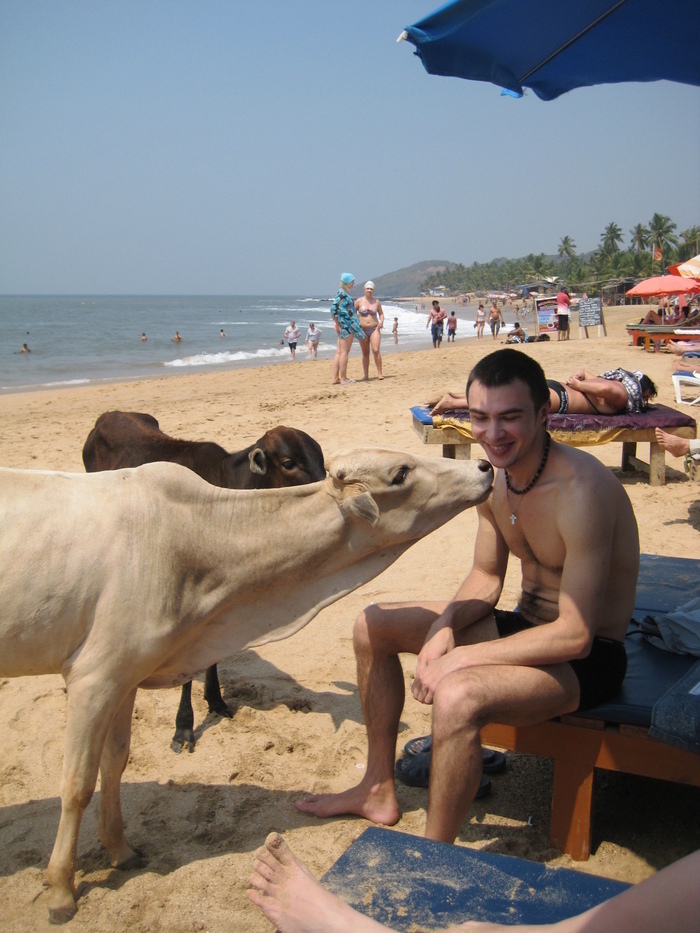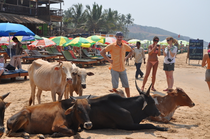 про коров. не знаю чьи это коровы, гуляющие повсюду. типа бездомных собак. они гуляют где хотят. могут перегородить проезжую часть. или даже лечь на дорогу. также ничто человеческое им не чуждо и они любят чилить на пляже. их никто не трогает. кроме собак. у них такая активность практикуется: собаки толпой атакуют корову и корова начинает от них убегать. потом корове надоедает убегать от собак, она разворачивается и бежит на собак, те от неё. все это происходит на пляже. загорающие пытаются не попасть под замес.