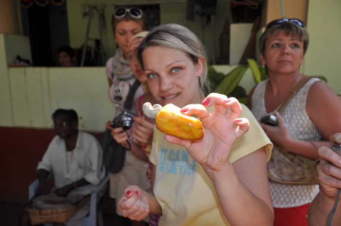 затем поехали на плантации пряностей. когда-то пряности были заветной целью всех торговцев. ради них Колумб совершил казавшимся немыслимым шаг - попробовал пересечь океан! на плантациях нам показали как растут всевозможные виды пряностей, фруктов. там же мы пообедали, накатив не мало этой самой фени - самогона из кешью. на жаре нас не плохо вштырило и мы поехали дальше. кто-то спросил гидшу про листья, которые индусы жуют постоянно. она показала нам это растение, сказала что это пан. он якобы стимулирует, придаёт бодрость. и предложила нам всем попробовать. боевая бабулька из Киева весело пошутила - "перед смертью надо все попробовать!" и начала жевать листья. напомню , что перед этим мы только выпили самогона.