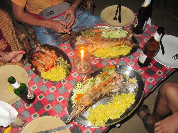 словил еще одно непередаваемое ощущение - это спать прямо под шум прибоя! интересно , что душевая и туалет находились прямо под открытым небом. сидишь так ночью на толчке а над тобой звездное небо и луна лежащая на спине! а утром к нам в гости в душевую пришел геккон. вечером мы пошли в ближайший шек поужинать. официант принес нам меню и тут же прямо предложил - хотим ли мы покурить? заказ мы ждали долго. официант видимо был обкуренный, потому что он потом еще несколько раз к нам подходил и спрашивал - что мы будем заказывать и не хотим ли мы марьиванну. это было смешно. заказ мы ждали долго.