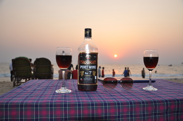 в Гоа не такой большой ассортимент алкогольных напитков. пиво king fisher, ром old monk, да и портвейн #7. Однажды мы попробовали шампанское! Но это было на свадьбе. не знаю откуда они его нарыли. а вот Портвейн №7 - очень достойный напиток. т.к. Гоа это бывшая португальская колония, а Португалия - родина портвейна, то они и научили местных делать его очень хорошо. рекомендую! ну а ром сам бог им велел делать, т.к. в Гоа произрастает сахарных тростник в изобилии. при производстве сахара из жмыха тростника и делают очень вкусный ром. также много где можно встретить повозки с механической соковыжималкой сахарного тростника (фото) очень вкусно. но посуду предлагают НЕ одноразовую. так что пробуйте на свой страх и риск.